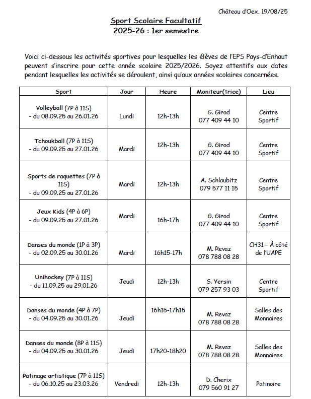 Liste des sports facultatifs 1er semestre 2025-2026